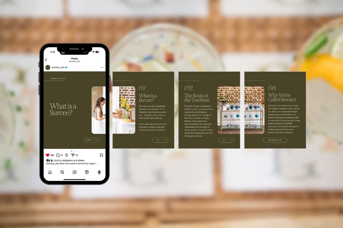 We were inspired by sentiment drawing from the owner’s grandfather, who returned from trips with thoughtful little gifts—surcees. We set out to design a brand that felt like just that: a small, meaningful gesture that leaves a lasting impression. Every detail was crafted to evoke warmth and ease, making the planning process feel as joyful as the celebration itself. The goal was to introduce something new to Charleston that didn’t feel new at all but rather like it had always belonged.