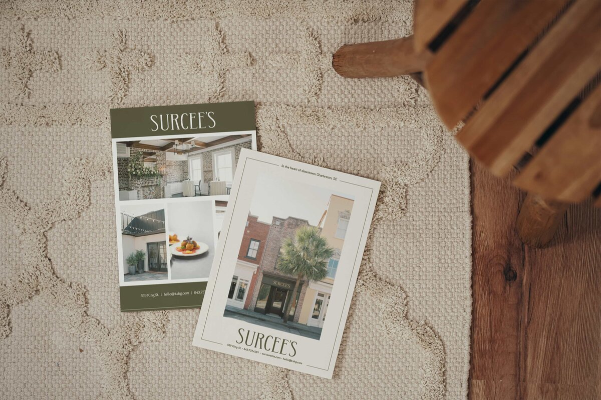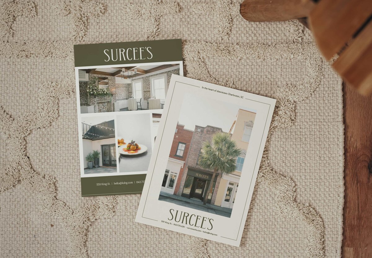 The visual identity for Surcee’s was designed to strike a deliberate balance: elegant without feeling precious, modern without losing its warmth. We wanted the brand to feel inviting to more than just brides. With a soothing gender-neutral color palette, fluid typography, and subtle nods to Charleston’s architectural charm, we created a system that feels versatile yet cohesive. The result is a brand that holds space for a range of gatherings, from editorial shoots to corporate dinners to celebrations that don’t fit into a single box.